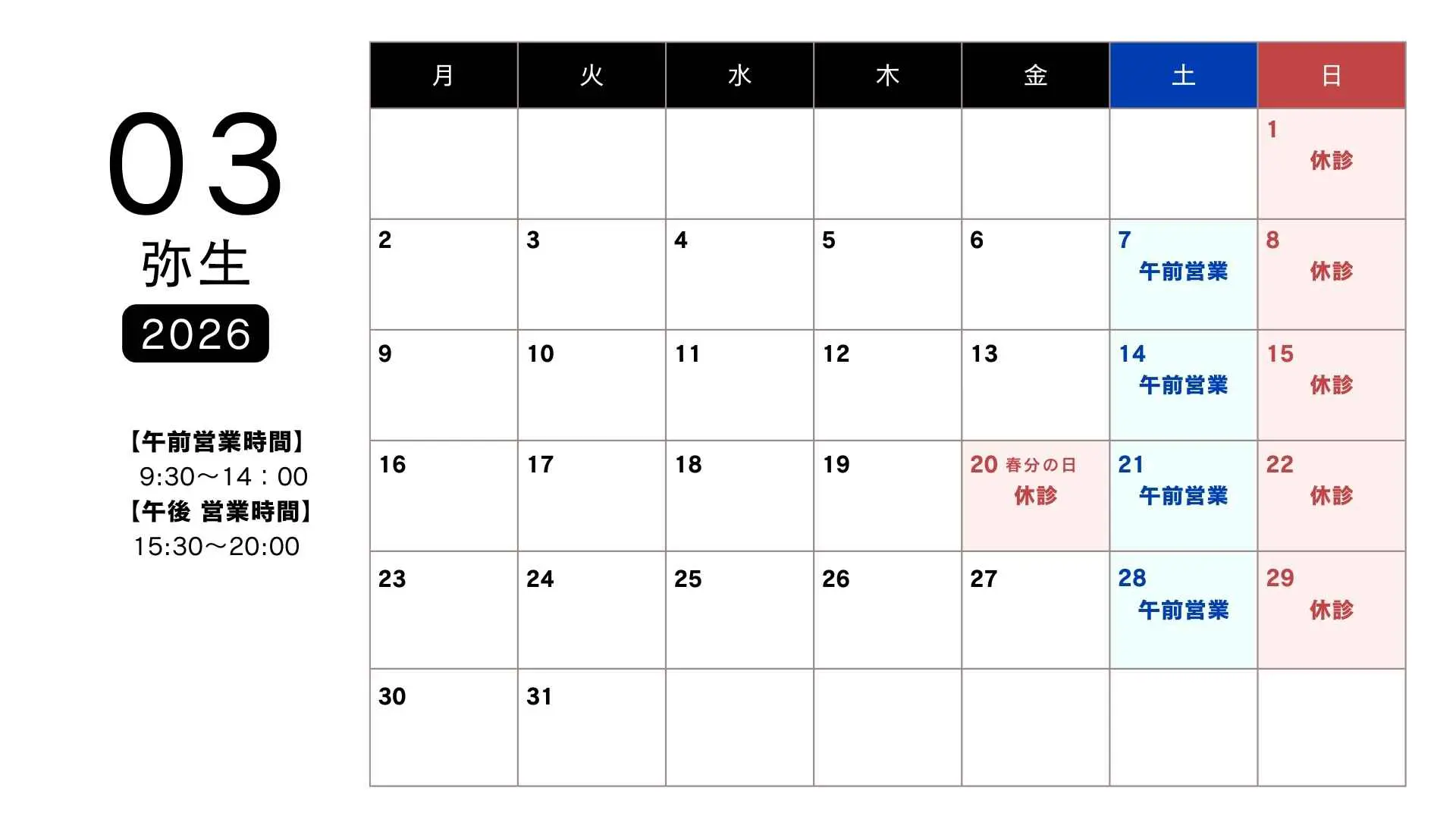 令和8年3月の休診日、午前営業日のお知らせです。